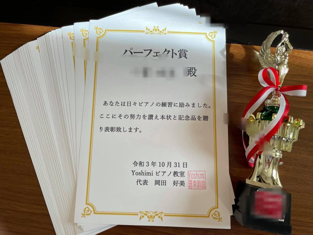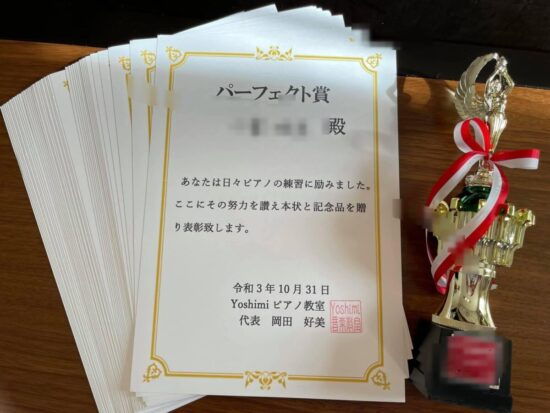 宿題と同じように毎日コツコツとピアノに向かうこと。来年はもっとパーフェクト賞が増える予感❣️