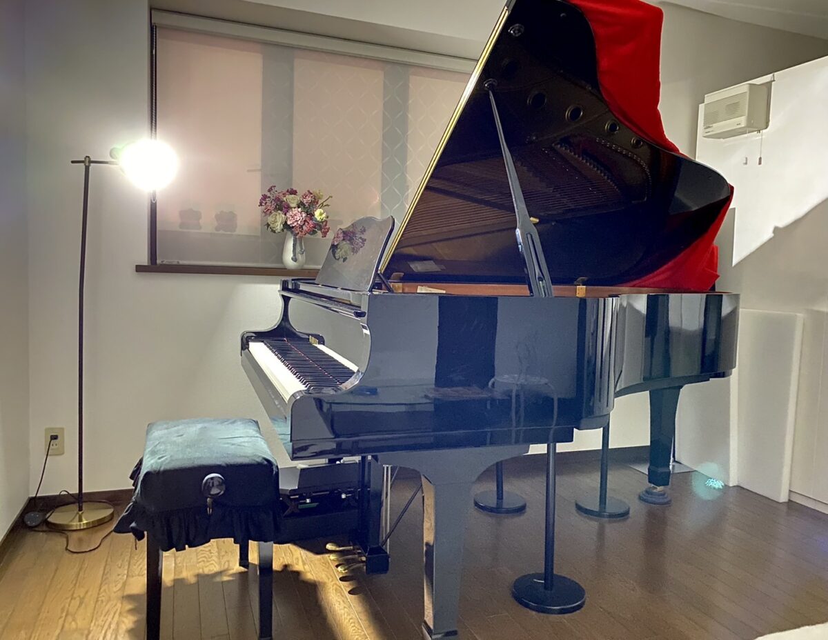 グランドピアノの蓋を全開にして、スポットライトをピアノに当てます。