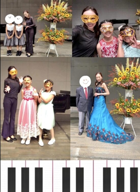 「先生、演奏している時これつけて応援してー!♡」仮面のプレゼント🎁ありがとう!✨ ピアノ以外にもタイプライターやベル🔔も使って演奏♪華やかな舞台でした👏