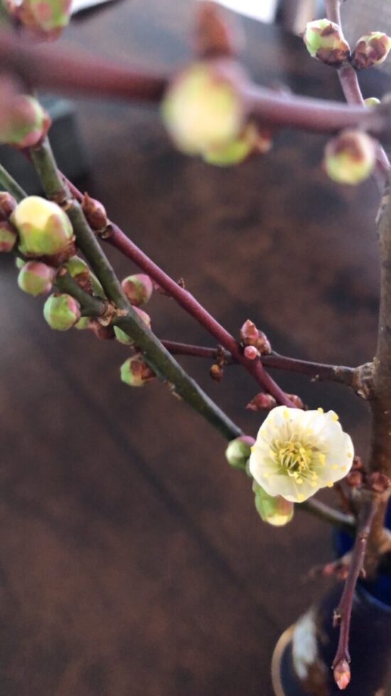 寒風の中、梅の蕾がほころんできました。2月ですね。