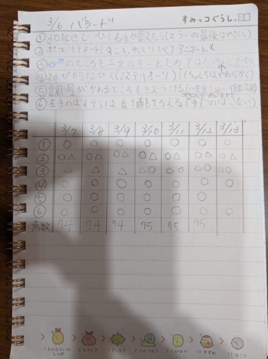 レッスンでアドバイスした私の言葉を忘れないようにノートに書き込んで練習しているそうです。最近、自分で気づく事がとても多くなったKちゃん!こんな工夫していたのですね☺